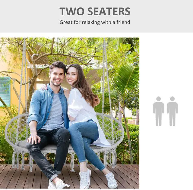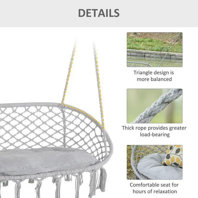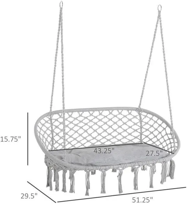 STYLISH HANGING CHAIR: This boho-style hammock hanging chair features a macrame net pattern hanging fringe tassels for an unmatched look of elegance. You can use it for relaxation or display it as a unique and decorative centerpiece. TWO SEATERS: The hammock swing chair is excellent for relaxing with a friend or as a spot to catch some alone time outdoors. This makes it ideal for front porches, below trees, garden, bedroom, living room, balcony and more COMFORTABLE SITTING: Handmade cotton composition and seat cushion bring a comfortable sitting experience when reading, watching TV, and charting. The lightweight design of the hanging chair allows easy setup, transport, and storage. METAL BODY: The porch swing chair's reinforced metal frame provides stability and long durability, while the robust construction is ideal for long-term use. The net pattern design allows air to circulate all day long, keeping you cool in hotter weather. OUTDOOR HANGING HAMMOCK SWING CHAIR DIMENSIONS: Overall Dimensions: 51.25" W x 29.5" D x 15.75" H, Weight Capacity: 704 lbs