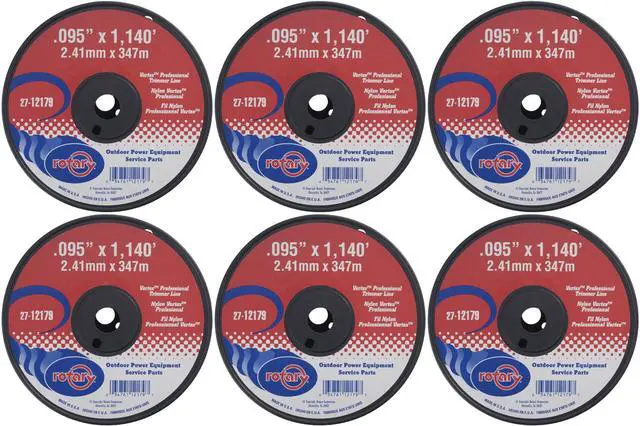 Six (6) pack of Vortex Trimmer Line 12179 with 0.095-inch diameter by 1,140-feet in length. This commercial trimmer line comes on a large 5 lbs. spool. Will fit most string trimmers and weed wackers. Twisted or spiral trimmer line provides a longer operating life compared to conventional line.