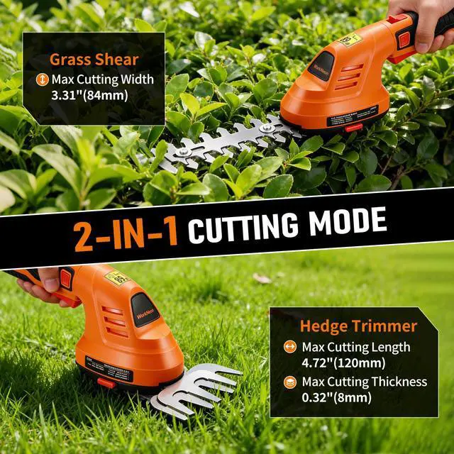 Rotatable Handle Design: The cordless hedge cutter with a 180° adjustable handle, will provide you comfortable gripping posture when trimming the left or right side of hedges. The compact design of the cordless grass trimmer ensures that it can fit into a variety of small spaces.