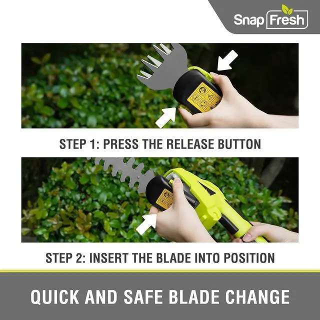 2-in-1 Grass Shears & Bush Trimmer - This cordless handheld combo includes a 5.5" long hedge trimmer blade and a 3.25" wide grass shear blade for versatile yard care. Cuts branches up to 0.31" (8mm) thick with clean results.