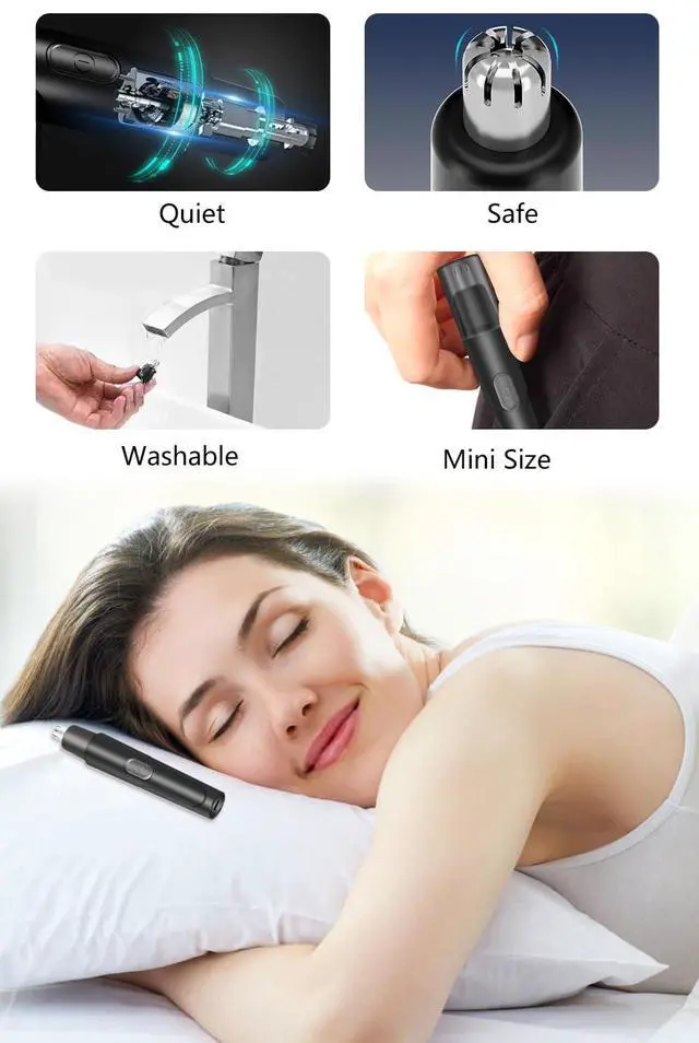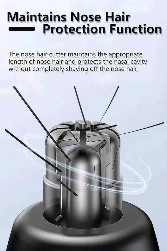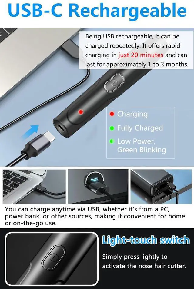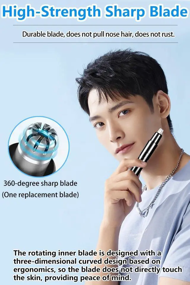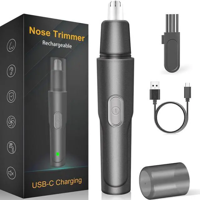 The package includes the nose hair trimmer, a cleaning brush, a USB-C cable, and a user manual