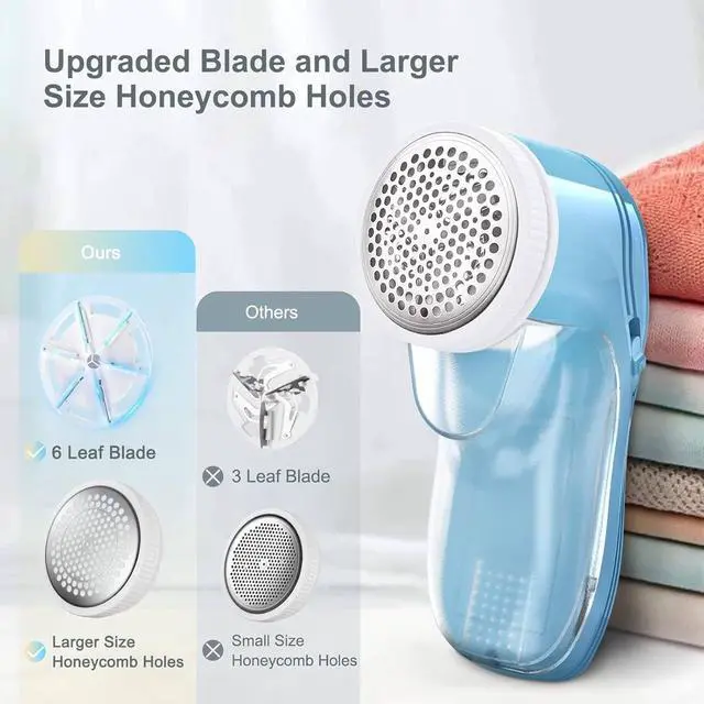 Efficient Fabric Shaver: The handheld fabric shaver uses large-size 6-leaf blades, compared to the traditional 3-leaf blades, we equip with 3pcs rust-proof 6-leaf blades, which can greatly improve the working efficiency. Built-in suction system and powerful motor, 3 shaving hole sizes, efficiency is increased by 100%, saving 50% of the time.