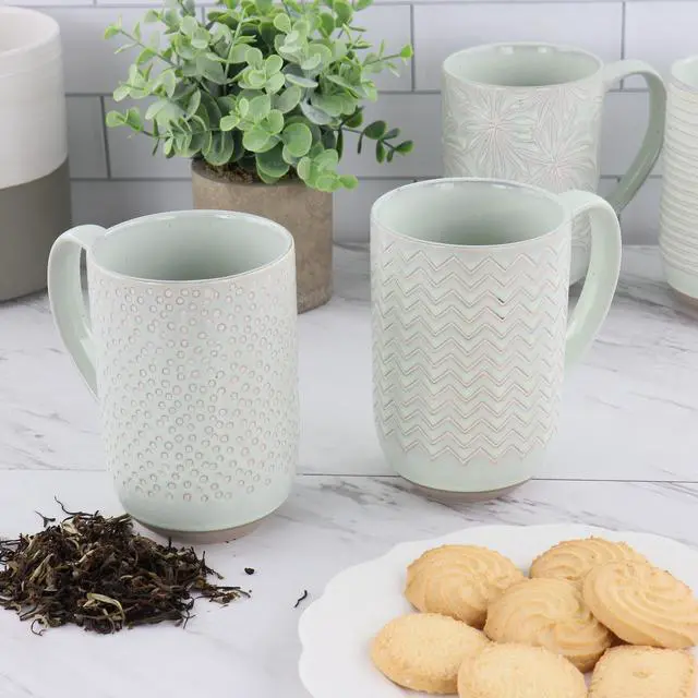 Enjoy a nice warm beverage with these Laurie Gates Madrina 19 Ounce 4 Piece Stoneware Assorted Wax Relief Designs. Each mug in this set has a different unique and beautiful design crafted with a wax relief technique. The designs stand out amazingly on top of the gorgeous mint green color. Made from durable stoneware, these mugs are built to last and are even dishwasher and microwave safe making them perfect for everyday use. Have a cozy night in with some tea or invite over a few friends for coffee, either way these mugs will be the center of attention.