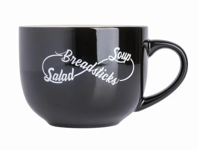Enjoy your morning brew with the Babish 17oz Breadsticks, Salad & Soup Latte Mug! Featuring tattoo artwork you may recognize, this mug is the perfect companion for your morning pick-me-up, or throughout the day for any beverage of your choice. Made from the finest porcelain, these mugs are dishwasher and microwave safe. Get the whole collection!