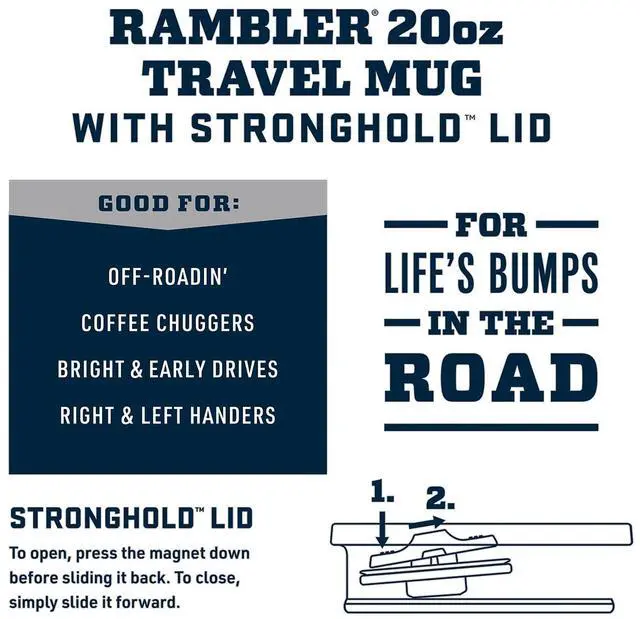 • Please Note: The Travel Mug can only use the Stronghold Lid and the Stronghold Lid wont fit other Rambler Drinkware models. The Travel Mug Stronghold Lid has 4 placement options and plays nice with both righties and lefties.