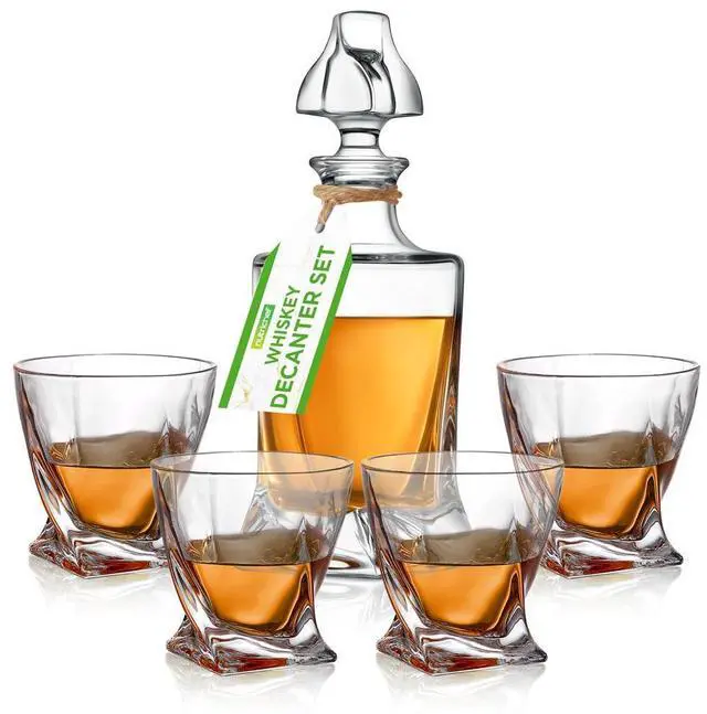 The NutriChef Whiskey Decanter Set is the perfect addition to your home bar. Featuring a 750ml ( 25.4 oz) crystal glass decanter with an aerator design, this set enhances the flavor and aroma of your favorite spirits. The decanter naturally aerates liquor to ensure a smooth and full-bodied taste, while also effectively separating sediment before pouring. The set includes 4 whiskey glasses, each with a 250ml ( 8.45 oz) capacity, and a decanter stopper to preserve the drink's quality. Made from BPA-free, food-grade safe crystal glass, this elegant set is both environmentally friendly and durable.