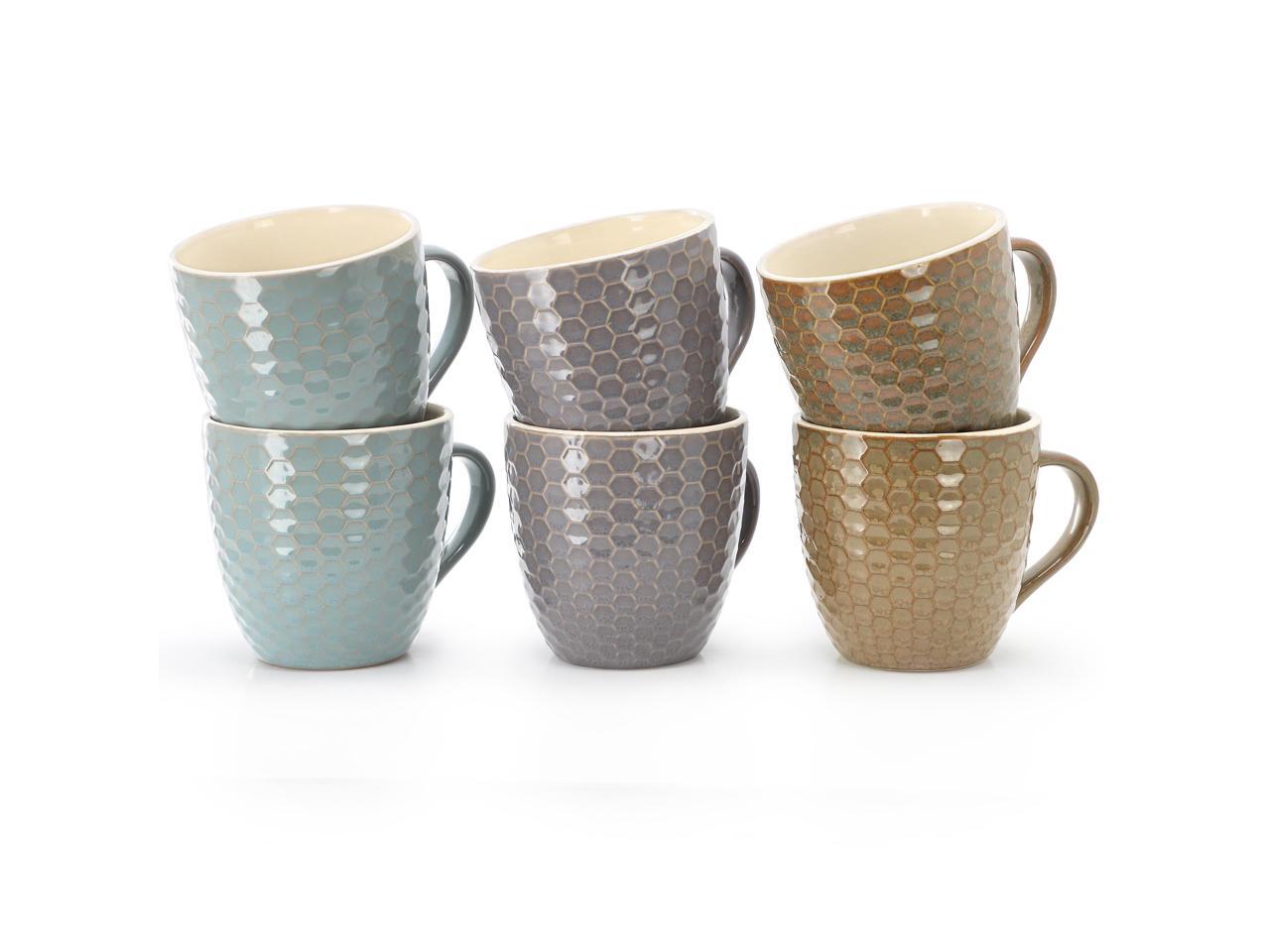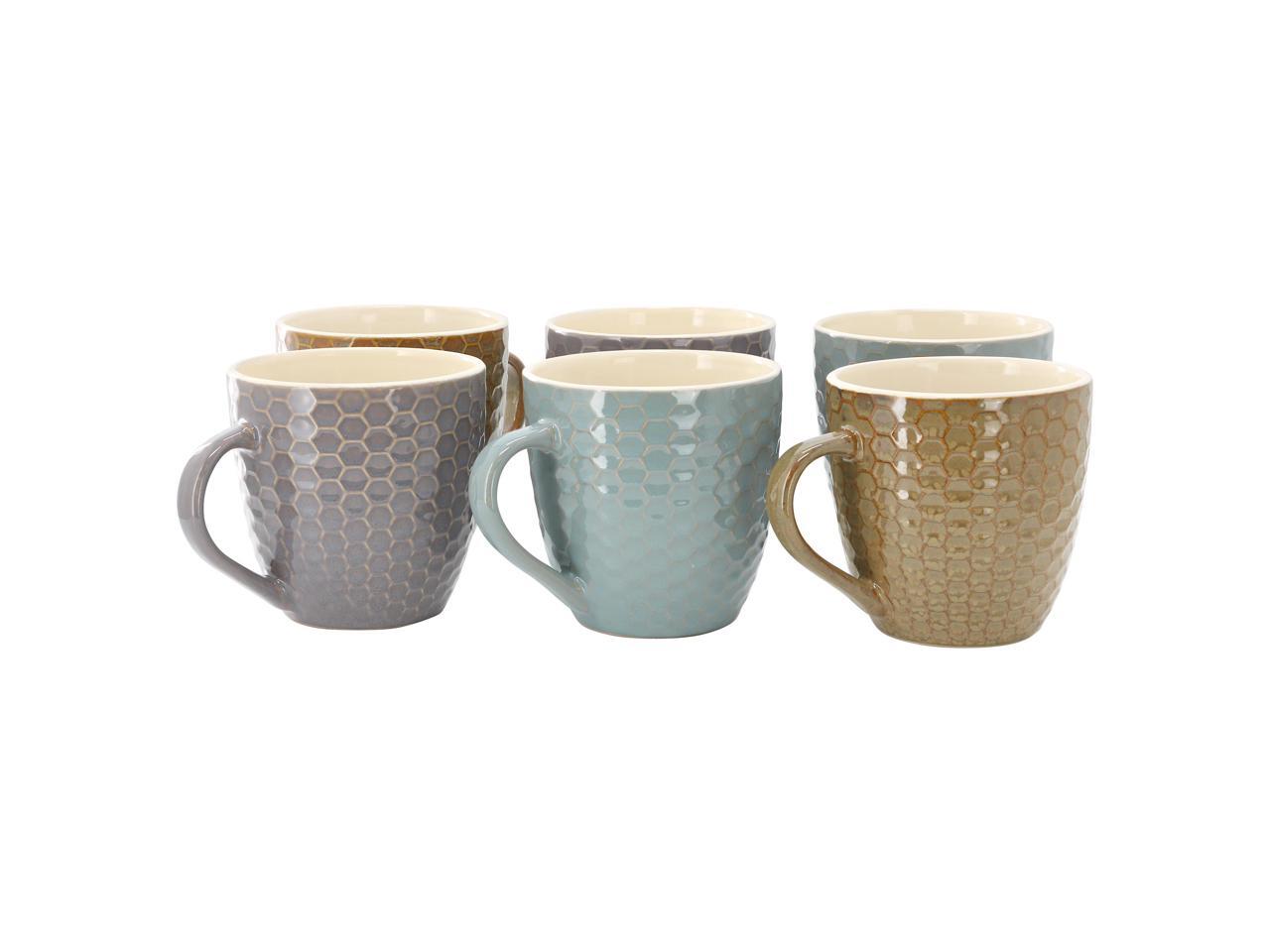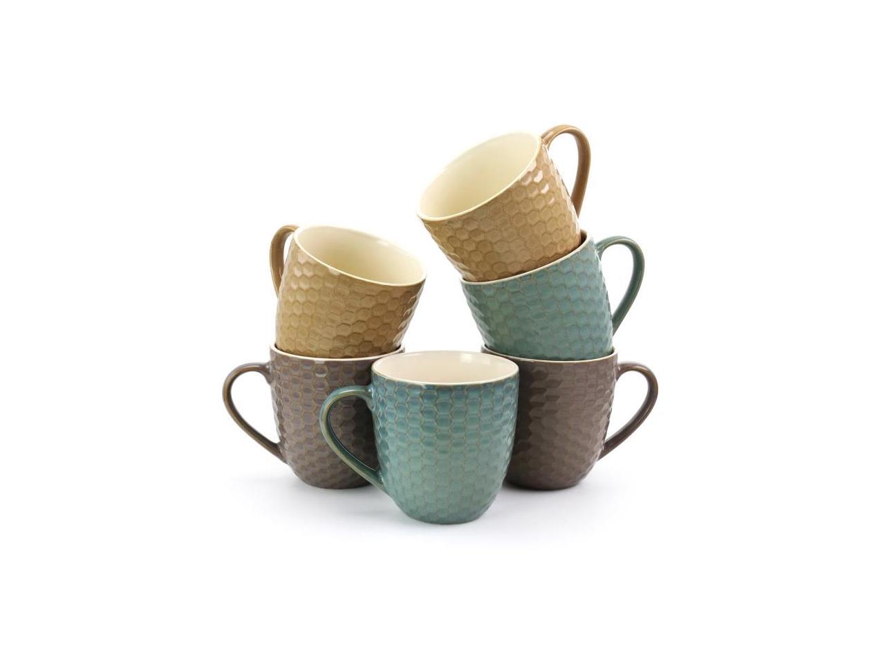 Set includes two taupe 15 oz. mugs, two teal 15 oz. mugs and two mocha 15 oz. mugs