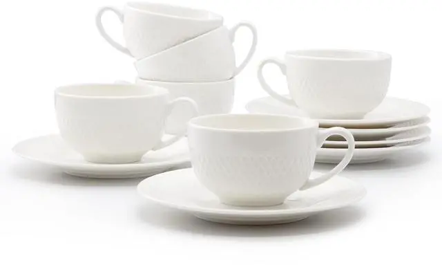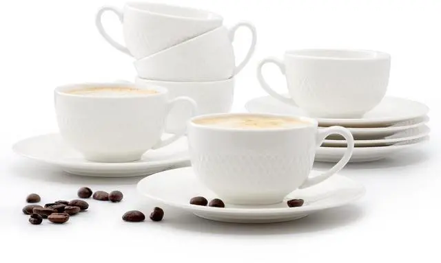 Elevate your coffee experience with the Elama Luna 12-Piece Espresso Cup Set. Crafted from durable porcelain, this set includes six 3-ounce espresso cups and six matching saucers, perfect for enjoying your favorite espresso, cappuccino, or macchiato. The glossy white finish and embossed design add a touch of elegance to any setting, whether you're hosting guests or savoring a quiet moment. The round shape and smooth finish of each cup make them comfortable to hold while enhancing your coffee presentation. This set brings sophistication and practicality together, making it an ideal addition to any kitchen or coffee bar.