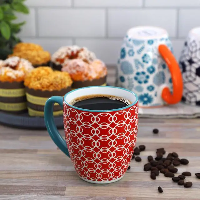 The Elama Rory 6 Piece 16 Ounce Assorted Design Stoneware Mug Set in assorted colors embodies a perfect balance of elegance and functionality. Each mug in this set showcases a unique blend of colors, shapes, designs and graphics. These mugs are not only visually appealing but also practical, crafted with dishwasher and microwave safe durable stoneware for long lasting, every day use.