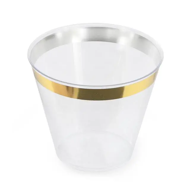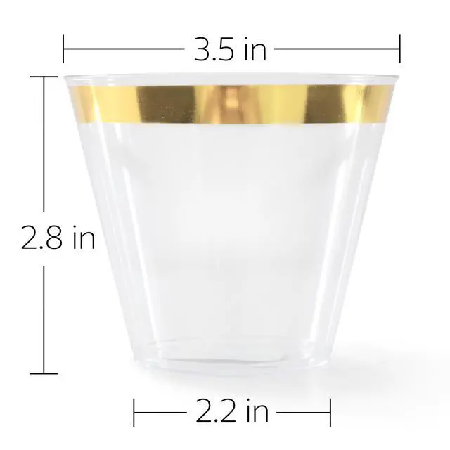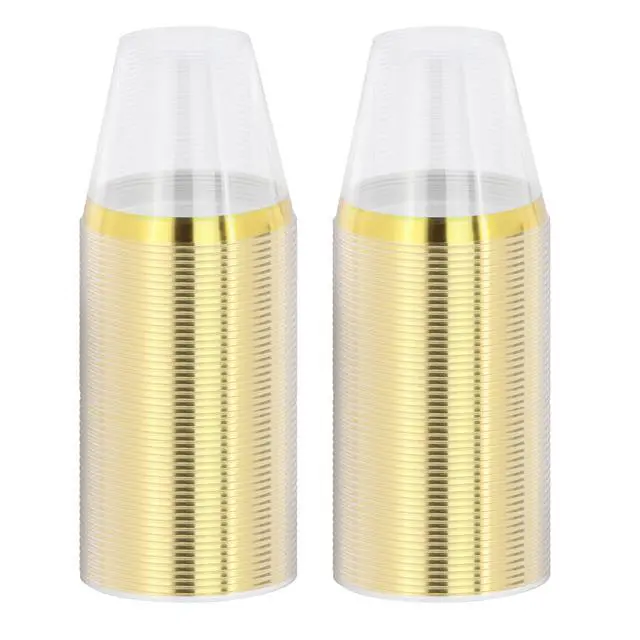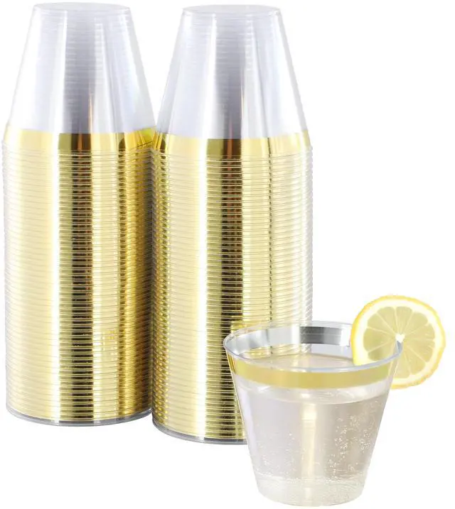 Elevate your next event with the Elama 100-Piece Disposable Plastic Gold Rimmed Party Cup Set designed to serve up to 100 guests. This elegant set features a clean gold color sophisticated trim, offering a perfect balance of style and functionality for weddings, parties, or any special occasion. Made from high-quality food-grade plastic, each piece is BPA-free, ensuring a safe dining experience for all guests.