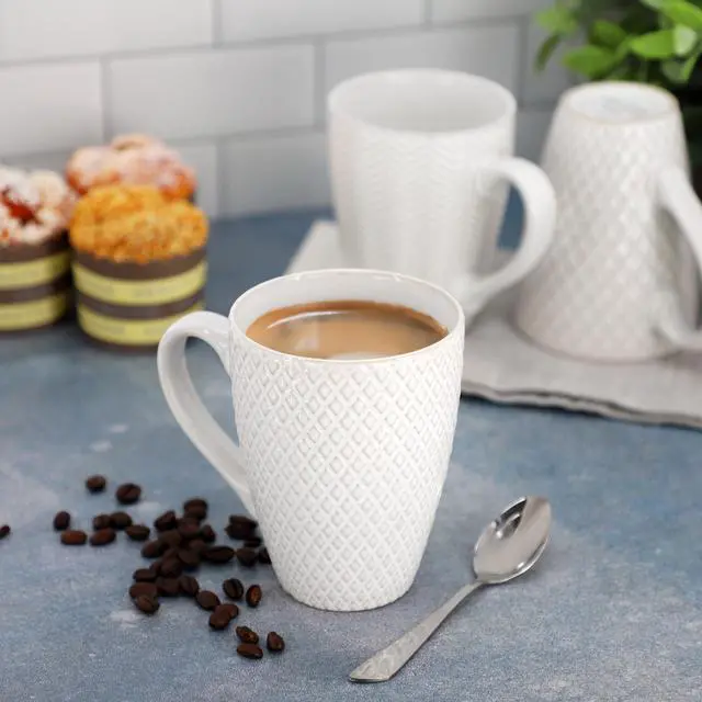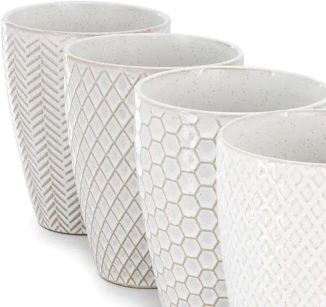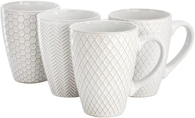 Add charm and character to your coffee routine with the Gibson Elite Earlhart 4 Piece 16 Ounce Stoneware Assorted Pattern Mug Set in White. Crafted from durable stoneware, these generously sized 16 oz mugs offer both everyday functionality and artisan-inspired style. Each mug features a unique embossed pattern in a classic white finish, adding a touch of texture and elegance to your kitchen or dining table.