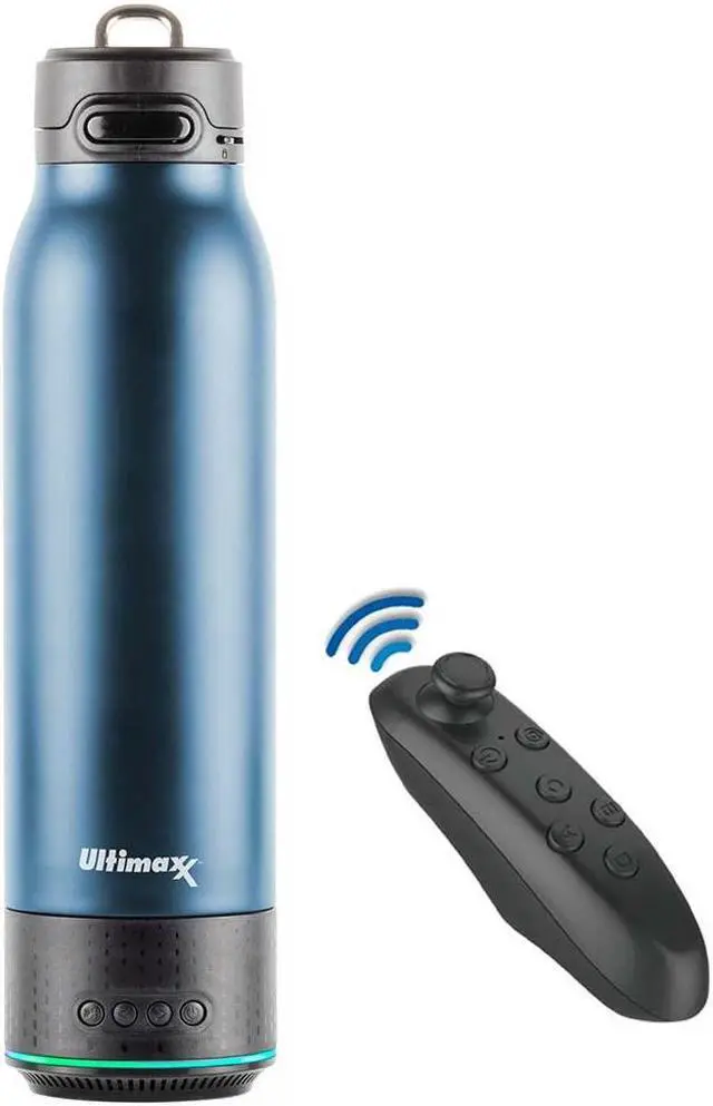 Vacuum Insulated Premium Water Bottle (Navy) with Rechargeable Bluetooth Speaker and Xtreme Mini Bluetooth Remote. Remote Doubles as Gaming Joystick/Mouse for Smartphone Apps.