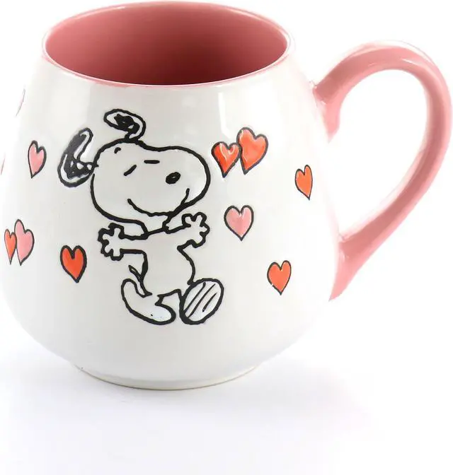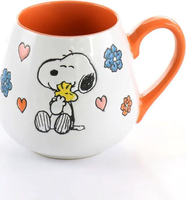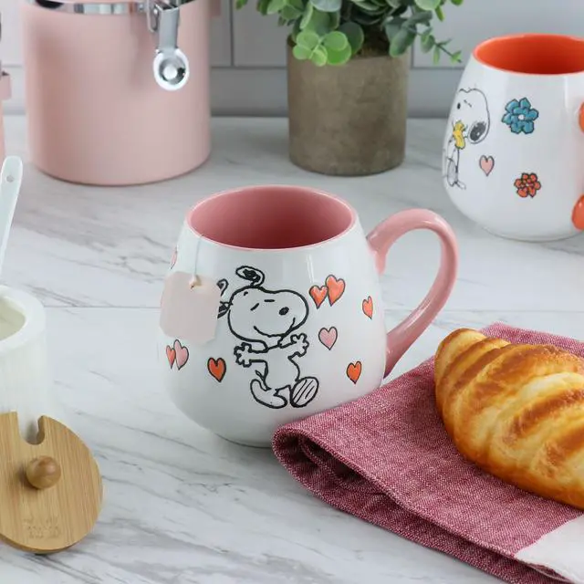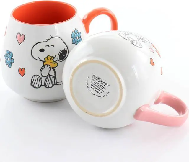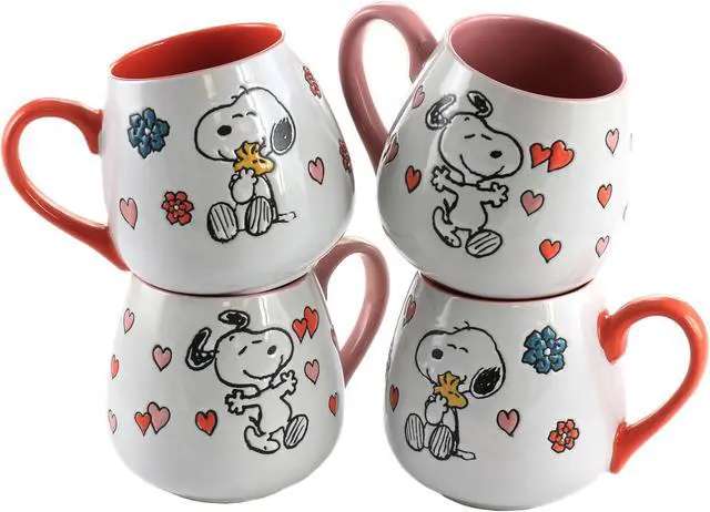 Show some love with these Peanuts 4 Piece 20 oz. Stoneware Wax Relief Cup in 2 Assorted Designs. One design features a pink handle and interior with the iconic Snoopy surrounded by adorable pink and red hearts. The other design features an orange handle and interior with the cute duo Snoopy and Woodstock sharing a warm hug surrounded by flowers and hearts. The wax relief design gives an interesting texture to the cup and the hand painted pictures makes each one unique. The high gloss finish makes these cups dishwasher and microwave safe meaning they are easy to care for and will last for years to come.