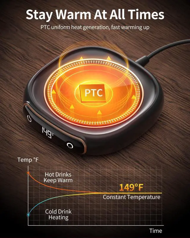 CONSTANT 149°F Temperature Our Coffee Mug Warmer ensures that your beverages stay at a consistent 149°F, providing a perfectly warm sip every time. Whether you're keeping your coffee hot or warming up a cold drink, this mug warmer maintains your desired temperature throughout. Tip: For even faster warming and better heat retention, use the lid to cover your cup.