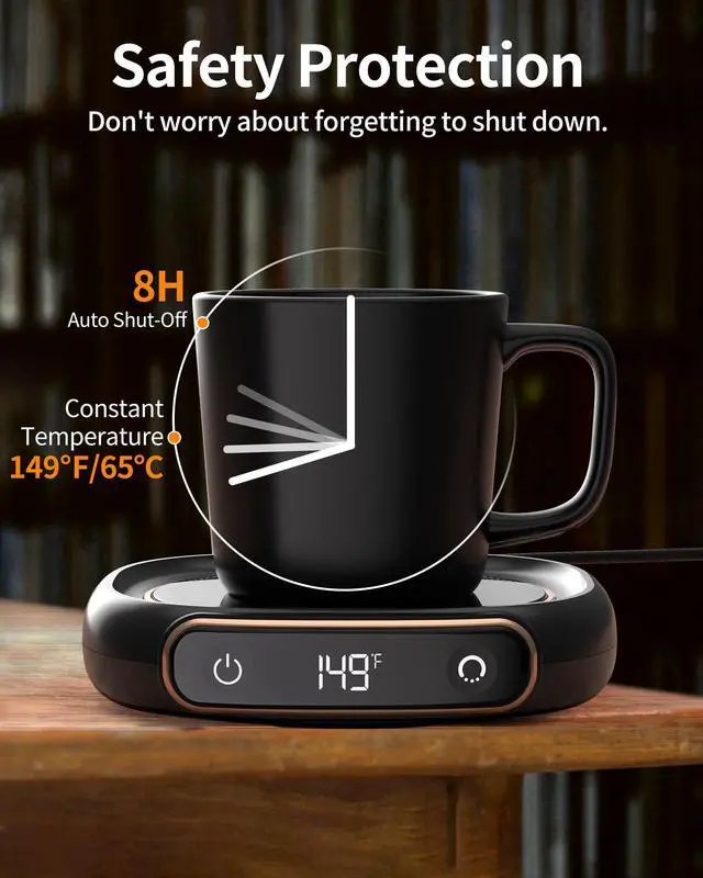 SAFETY & EFFICIENCY Mug warmer features an automatic shut-off function that activates after 8 hours of continuous use, ensuring peace of mind and safety. Its low-power design keeps your coffee or tea warm efficiently, making it ideal for long work sessions or extended relaxation periods. Additionally, the anti-slip bottom provides stable placement on various tabletops, enhancing overall safety