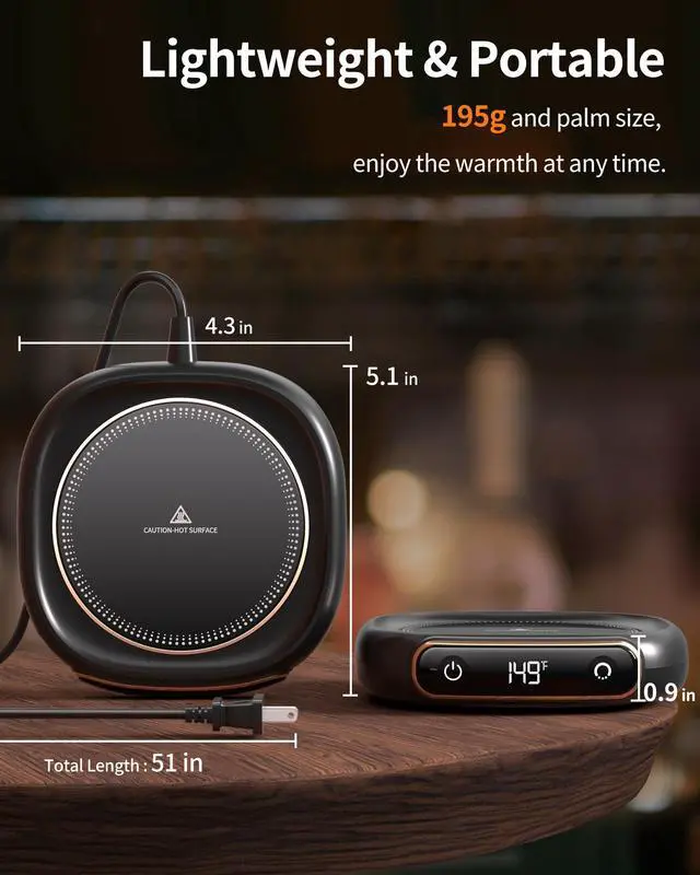 PORTABLE and Easy to Clean Our coffee cup heater features a 1.3m (51-inch) power cord, weighs just 7 ounces, and is only 0.9 inches thick, making it easy to use anywhere. Constructed from durable ABS and aluminum alloy with an upgraded metal heating plate, it heats up quickly and is easy to clean. Additionally, it operates quietly, ensuring a peaceful environment.