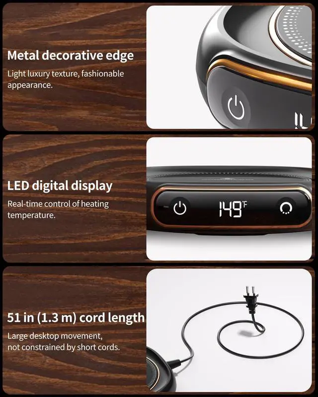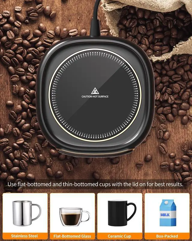 3 ADJUSTABLE Temperature Choose from 113°F, 131°F, or 149°F with a simple tap to match your preferred warmth. Perfect for coffee, milk, chocolate, or tea. Best suited for flat/thin-bottomed stainless steel, ceramic, or glass cups. Also works as a candle warmer. Keeps your drink at the ideal temperature whether youre working or relaxing.