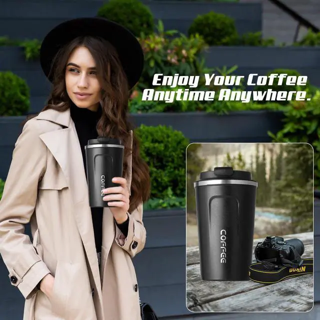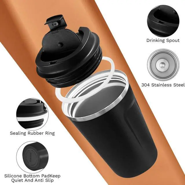 Convenient one-hand drinking: The travel coffee mug features an eco-friendly flip-open lid that is easy to twist open and close. The lid includes a sealed silicone ring to prevent leaks and spills. It also has a drinking hole for direct sipping or using a small straw. Silicone sleeve on the body for easy gripping.
