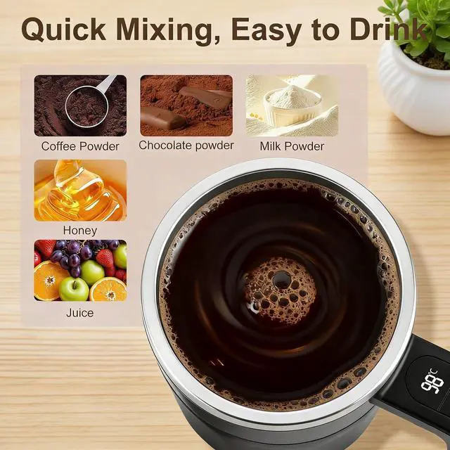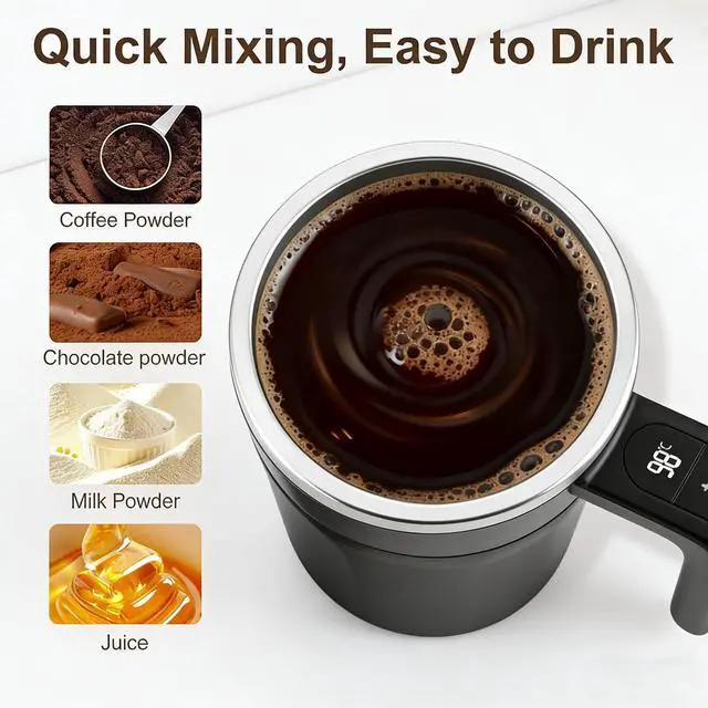 One-Click Auto StirringDouble-click to start magnetic stirring, 20s fast even mixing for clump-free drinks, no manual operation needed. Real-Time Temp Display & Safe UseHandle screen shows liquid temp to prevent scalds; leak-proof body + splash-resistant lid for spill-free sipping.