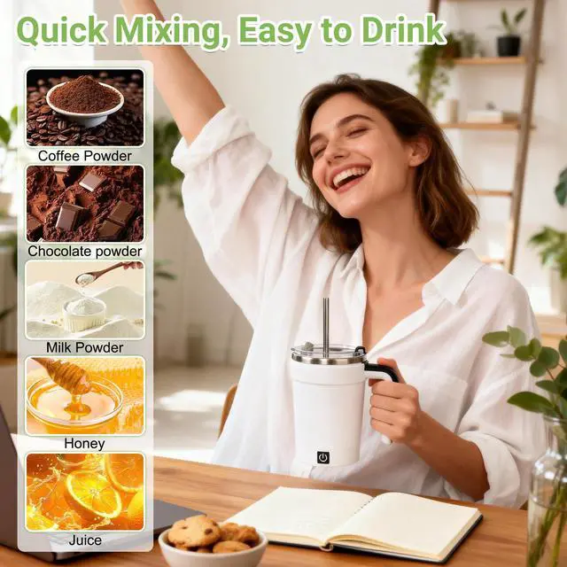 One-Touch Intelligent Mixing & Temperature Monitoring: Self stirring coffee mug activate the self-stirring function with a simple double-tap for quick, clump-free blending in seconds. Self stirring mug the integrated handle display shows the exact liquid temperature in real-time, while the secure, splash-proof lid ensures mess-free use.
