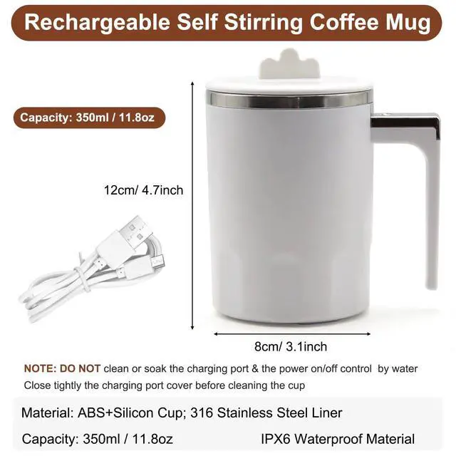The automatic magnetic coffee mug is made of food grade material, ABS+Silicon body and 316 Stainless Steel Liner; USB rechargeable, Capacity: 350ml / 11.8oz, IPX6 Waterproof Material. NOTE: DO NOT soak the mug.