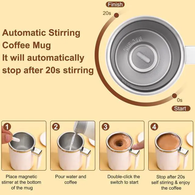 Easy to operate the self-stirring magnetic coffee mug, Step1: Place magnetic stirrer at the bottom of the mug, Step2: Pour water and coffee, Step3: Double-click the switch to start, Step4: Stop after 20s self stirring & enjoy the coffee. It will automatically stop after 20s stirring.