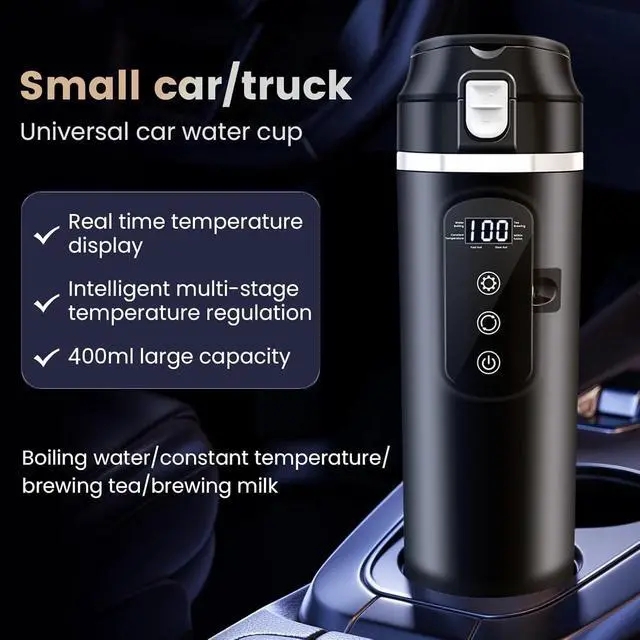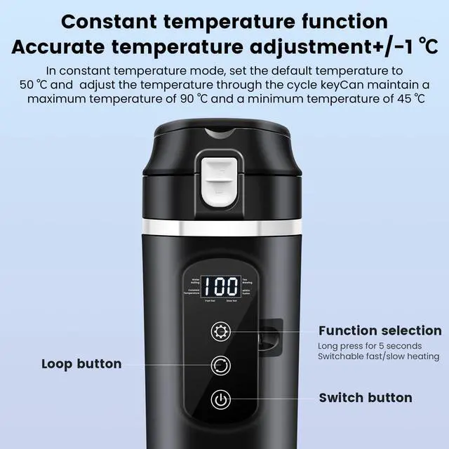 PORTABLE ELECTRIC CAR TRAVEL ELECTRIC CUP- Smart car kettle with smart touch panel, you can quickly select different temperature ranges by touching "", "Boil 100°C", "Tea90°C", "Milk=45°C", "Warm: You can set the temperature by "O". Touch panel for quick control.