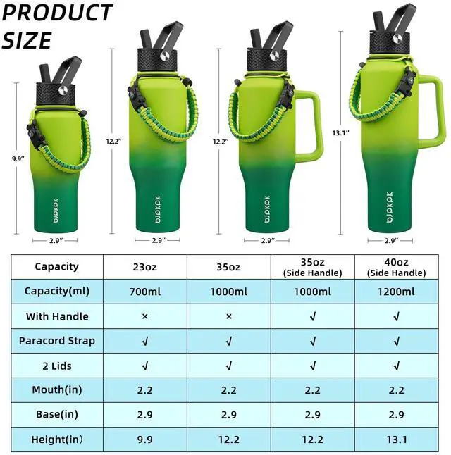 - Multiple sizes (23oz, 35oz, 35oz-with side handle, 40oz-with side handle), multiple color, a full set accessories.