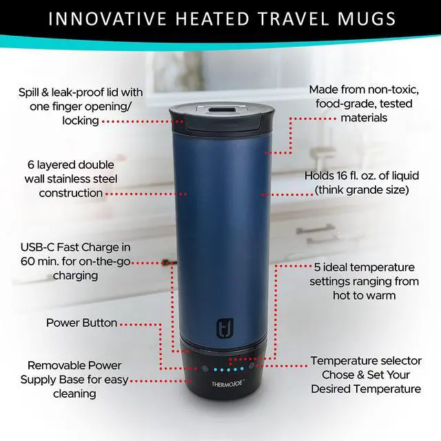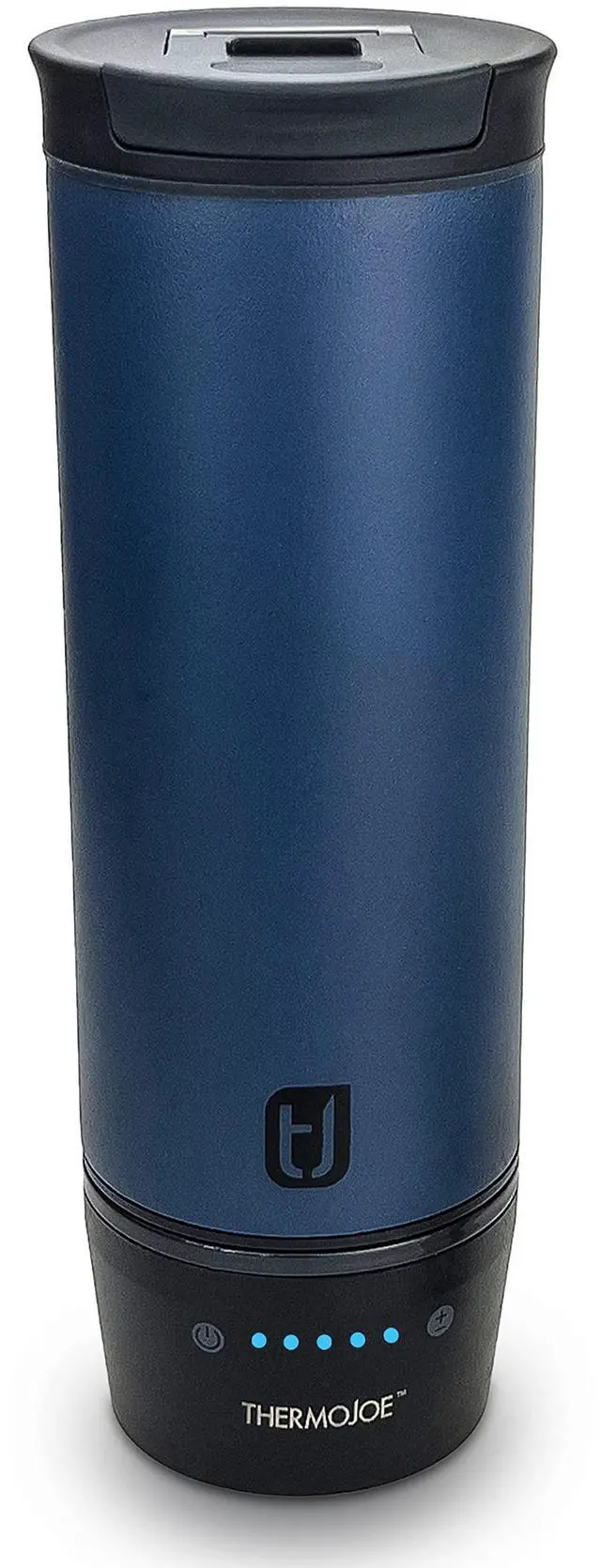 The Ultimate Travel Mug Go anywhere unplugged with the Thermojoe Smart Travel Mug! This battery powered self-heating, smart mug is perfect for all of your warm, hot and cold beverage needs. It features an, interchangeable battery power supply to keep your coffee, tea, hot chocolate, chai, cider, mulled wine and other drinks the perfect temperature! Take this innovative smart travel mug with you on road trips, hiking, camping or anywhere else you decide to go.