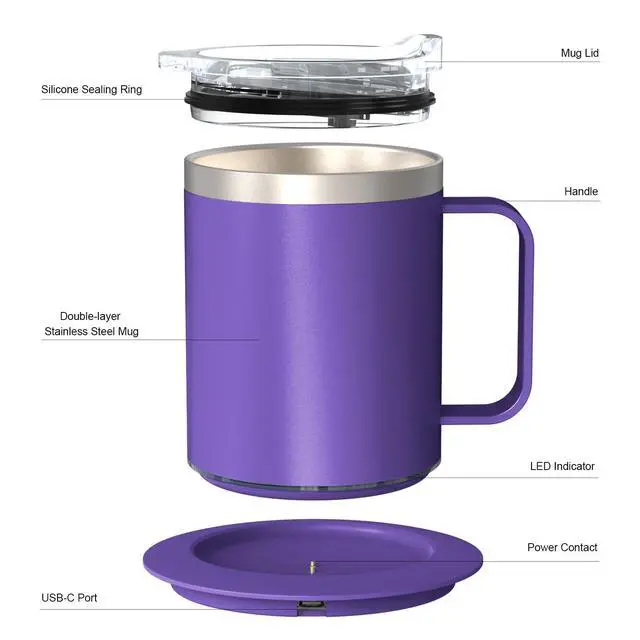 12oz heated mug,spill-resistant lid, power base,59in USB C cable,user manual.