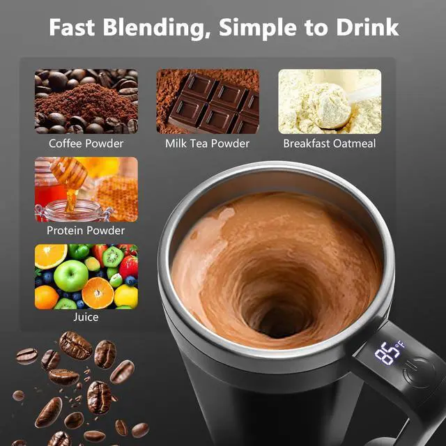 This self stirring mug is perfect for blending a variety of drinks, such as coffee, milk, cocoa powder, and protein powder. It blends coffee or drinks in 20 seconds, eliminating clumping and manual mixing.