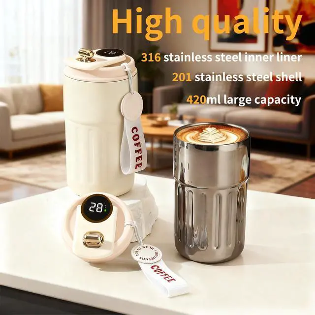 travel mugs for coffee, 14 oz Stainless Steel Coffee Mug, Vacuum Insulated Tumbler with temperature display, Coffee Thermos Outdoor, Camping Mug with Leak-Proof Lid, Portable Cups for Keep Hot/Ice
