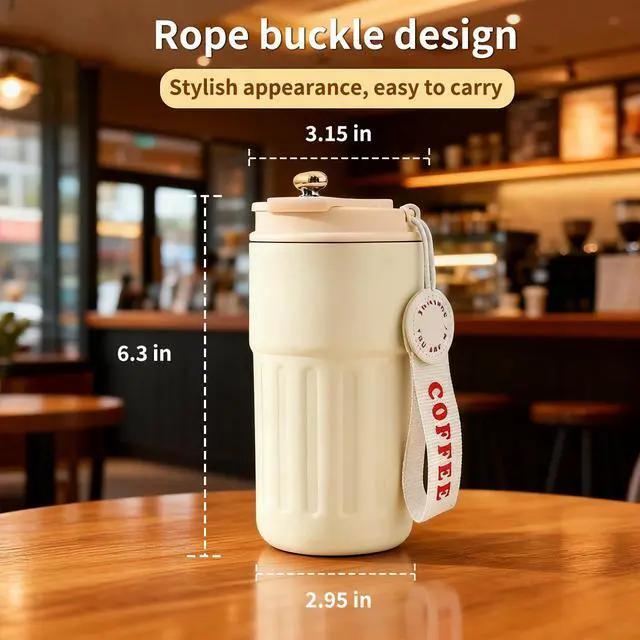 PORTABLE COFFEE MUGInsulated cup with lifting rope for easy carrying and the flip lid opens and locks easily.The water bottle is perfectly suitable for daily use, running, hiking, camping, etc.Fit for most of the car cup holder, bike rack and hiking backpack.