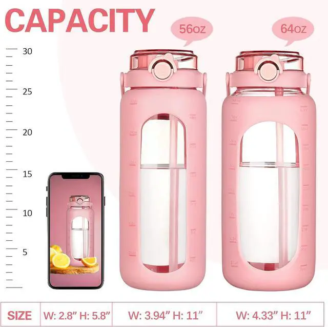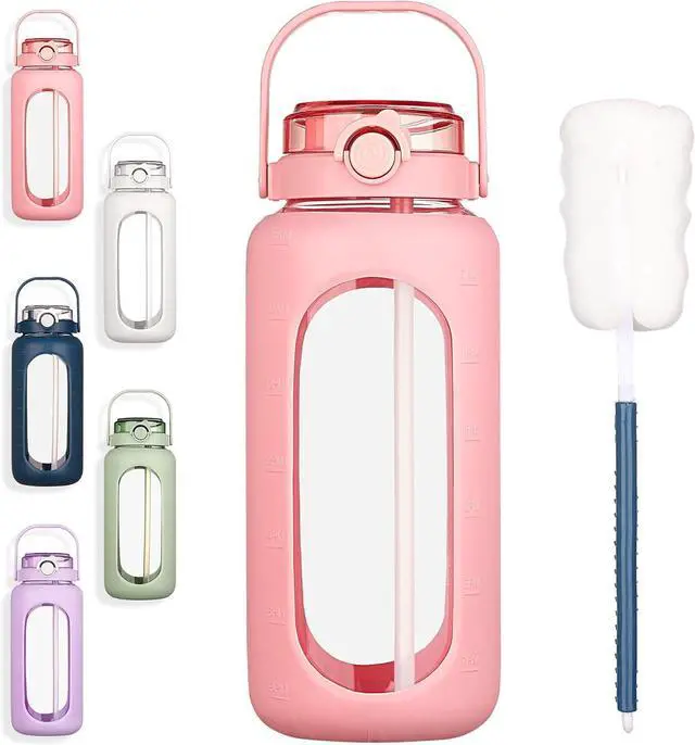 Durable: The silicone sleeve covers most of the half gallon water bottle for protection. Not only does it keep your drinks cold for hours, but also makes this motivated glass water bottle more durable. The wide mouth of this huge glass water bottle makes it easier to refill large pieces of ice cubes and fruit, and with help of time and oz markers, you will easily track your daily water intake and drink more water throughout the day.