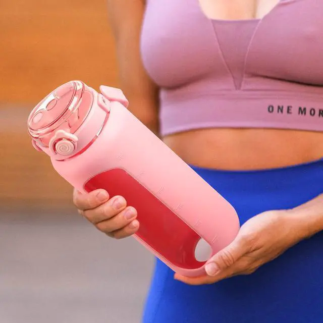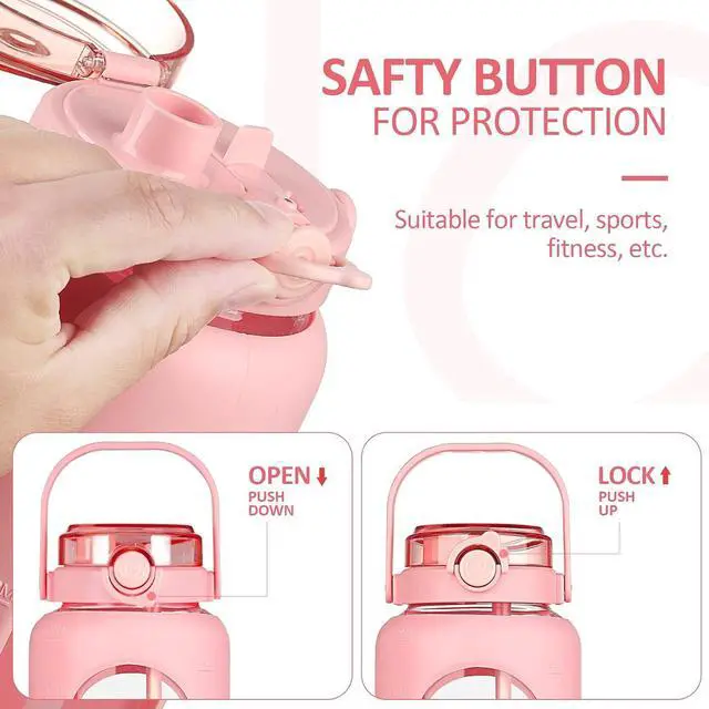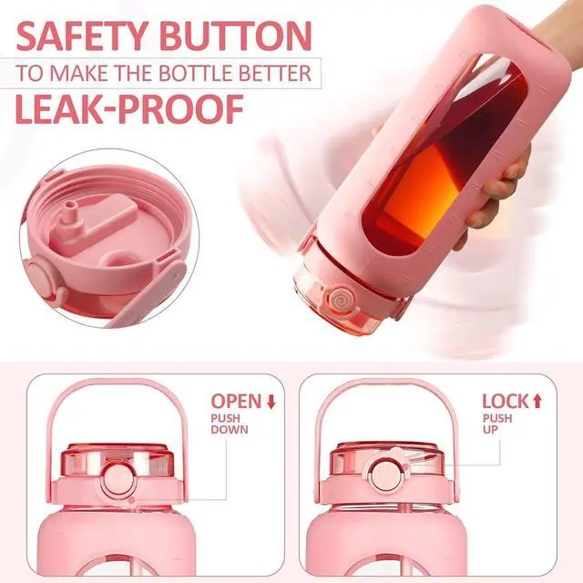 Lockable & Leakproof Flip Lid: The handy, lockable flip lid prevents leaks and can be opened with one hand for those times when youre on the move and your arms are full. Our leak-proof glass water bottle with straw makes your drinking dribble-free. The straw spout gives you a comfortable and quick drinking experience and this glass water bottles with time marker comes with 2 straws and the carrying handle on top makes it easy to tote around town.
