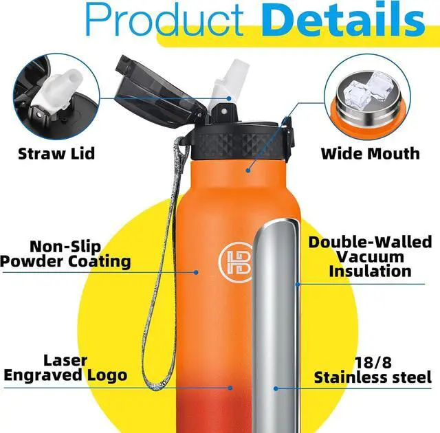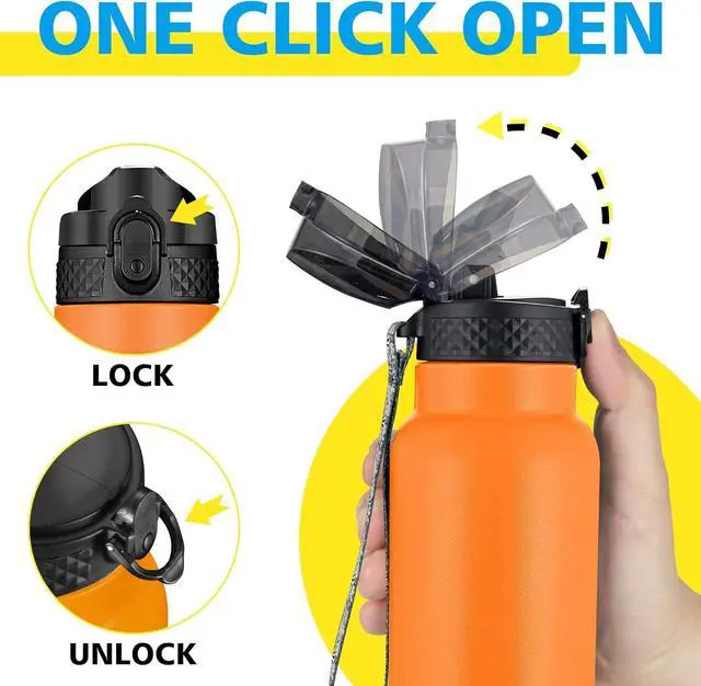 : The insulated thermal flask, water bottle with straw, spill proof flip top lid is designed with a secure lock and sealing ring, ensure water jug dust proof and leak proof. The powder coat exterior finish is scratch resistant, non slip and easy to grap. The water flask 2 inch wide mouth for easy to add ice cubes. This thermal water bottle is dishwasher safe. *:. *