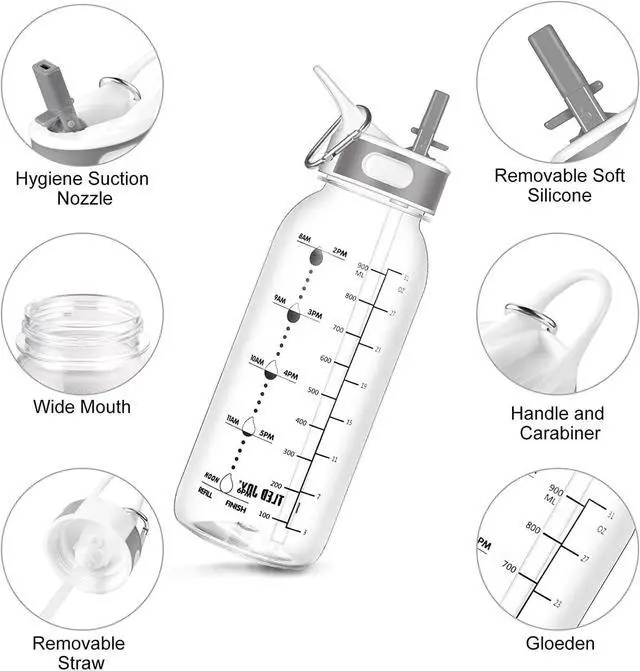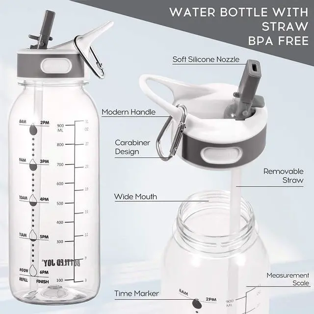 [Large capacity & portable] The 32oz clear water bottle with straw can replenish the water needed by the human body at any time. It is easy to hold and easy to hang on a backpack or put it on a bicycle. Carabiner and handle ring can be well adapted to outdoor camping environment. The wide-mouth design is easy to fill with ice cubes, fruit slices and protein powder. Replenish water and nutrition.