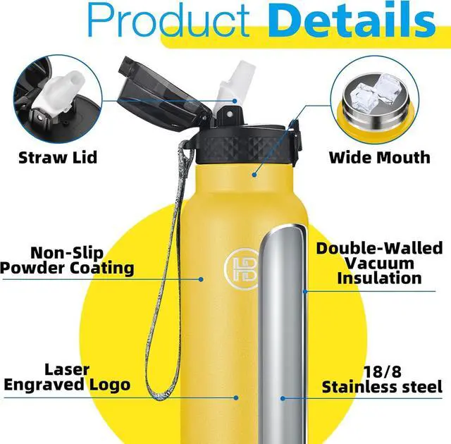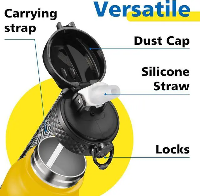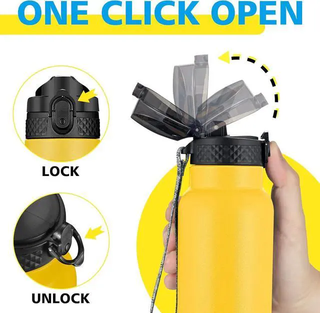 : The insulated thermal flask, water bottle with straw, spill proof flip top lid is designed with a secure lock and sealing ring, ensure water jug dust proof and leak proof. One click open to free you hand and enjoy fast hydration. The powder coat exterior finish is scratch resistant, non slip and easy to grap. The water flask 2 inch wide mouth for easy to add ice cubes. This thermal water bottle is dishwasher safe. *:. *