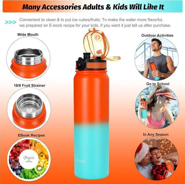 Oldley Insulated Water Bottle with Straw 32oz Stainless Steel Water Bottles with 3 lids Double-Wall Vacuum Thermal for Kids Adults School Sports, Bright Orange-green