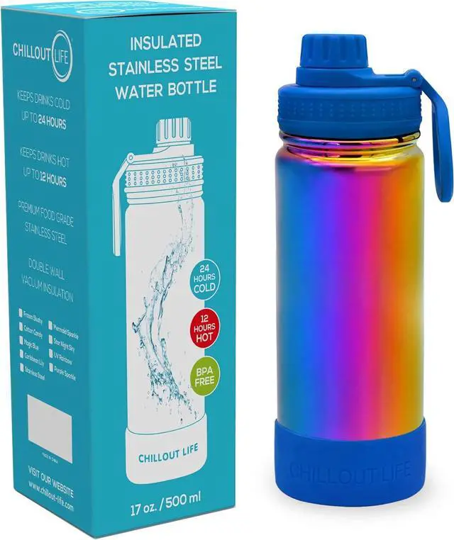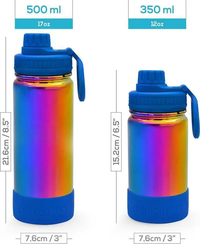 Your Drink On The Go Has Never Been Better - CHILLOUT LIFE brings you our latest double walled, vacuum insulated, 18/8 stainless steel drinking bottles with handle / insulated kids water bottles with spout cover, so your cold drinks will stay ice cold for up to 24 hours. Our bottles are BPA free and non-toxic so totally safe for you and your kids to enjoy. Choose between 3 sizes for children and adults and selection of designs to suit your personal preference.