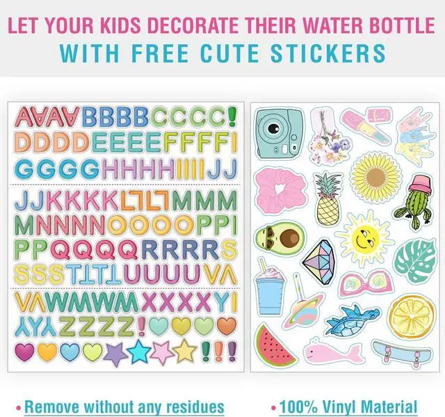 Have Fun With Our Adorable Bonus Stickers - These high quality waterproof vinyl funny stickers, are the perfect accessory to personalize your kids water bottle. These decals can also be used to personalize notebooks, laptops, computers, cell phones or anything else that comes to mind. These cute stickers set you apart from the crowd.