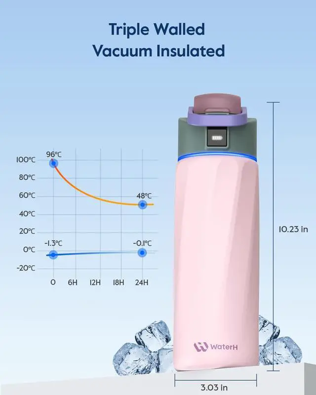 PRACTICAL USE DESIGNED: Stay refreshed with our leak-proof, stainless steel water bottle, which also keeps carbonated drinks fizzy. The wide-mouth design makes it easy to add ice cubes and fruit. The 24oz compact design fits seamlessly into car cup holders and subtle front grooves ensure a secure, slip-resistant grip. Each charge lasts up to two weeks, offering long-lasting convenience. Plus, the cap handle flips 180 degrees for easy carrying during outdoor activities.