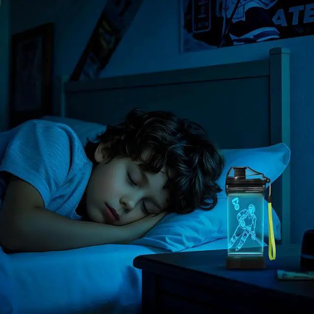 COOL DESIGN. Water bottle + night light + hockey pattern (3 IN 1). The glow in the dark baseball water bottle is a combination of art and technology that creates an optical 3D illusion and challenge your mind.