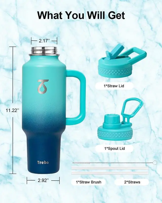 Accessories: Included with the Trebo 40 ounce reusable insulated tumbler are two lids, two straws, and a straw brush. We back the T-shaped car bottles, and our friendly customer care team is always ready to assist.