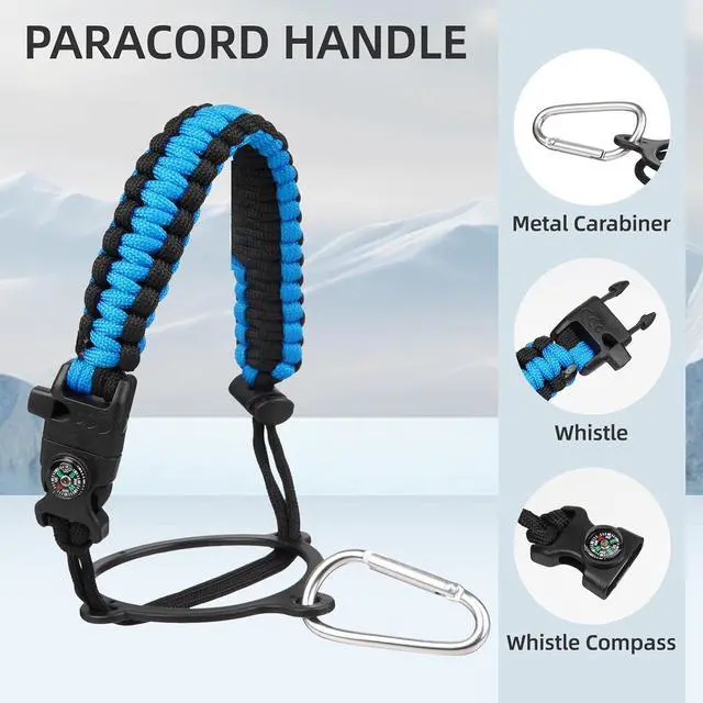 The large capacity gallon water jug comes in various sizes, including 50 oz, 64 oz, 87 oz, and 128 oz, with a range of colors to choose from according to your need. All sizes of bottles equip with a paracord handle and a pouch for easy carrying
