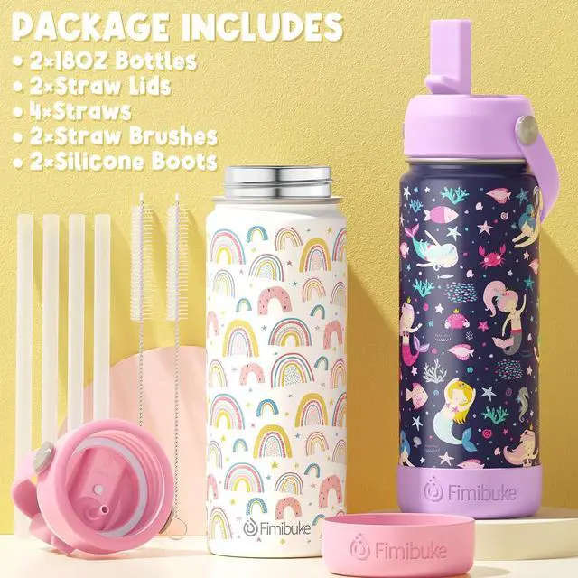 SAFE MATERIALS FOR KIDS: Fimibuke kids insulated water bottle is made of premium 18/8 stainless steel, fully resistant to oxidation and corrosion. This water bottle comprises BPA-free, food-safe, non-toxic materials, making it safe for your kids. In order to maintain the vibrant colors, please clean the cup by hand washing. This metal water bottles for kids includes 2 Toddler Stainless Steel Water Bottles, 2 Leak Proof Lids, 4 Straws, 2 Straw Cleaning Brushes
