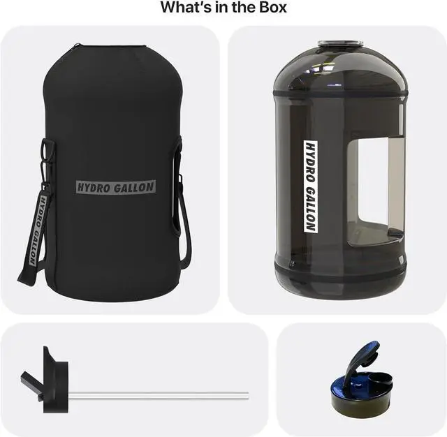 Includes - 1 Gallon Water Bottle (Plastic - Not insulated), Carrying Sleeve (Neoprene), Adjustable Shoulder Strap, Straw Lid with detachable straw, Spout Lid. Giftable Box.