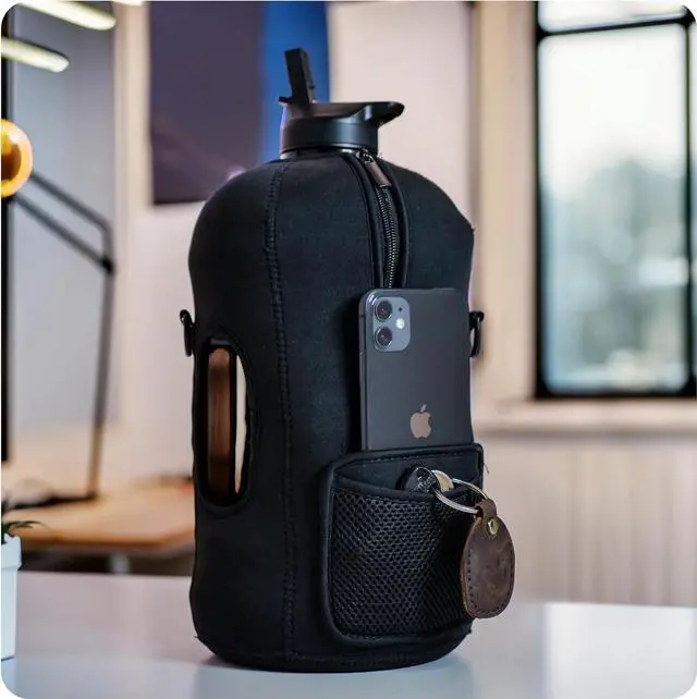 Hydro Gallon Sleeve - Patented Neoprene Sleeve Holder / Sling that prevents sweating and is lightly insulating. Big double pocket for your phone, keys, etc.. Zipper to easily take off / put on the sleeve.