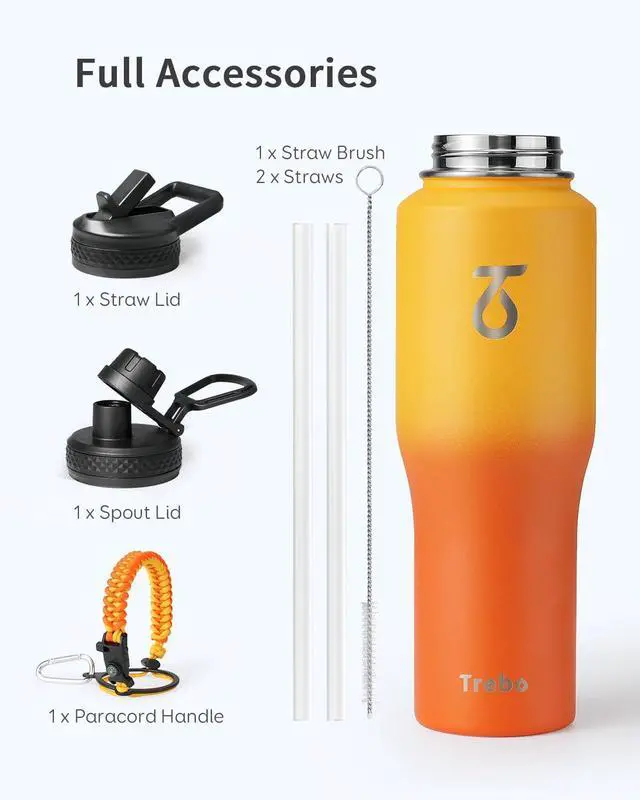 Professional Support: Included with 2wide mouth lids, 1 survival paracord, 2 straws, and 1 straw brush, this Trebo insulated bottle is fully accessorized to handle any tricky situations. Our friendly customer care is always happy to help.