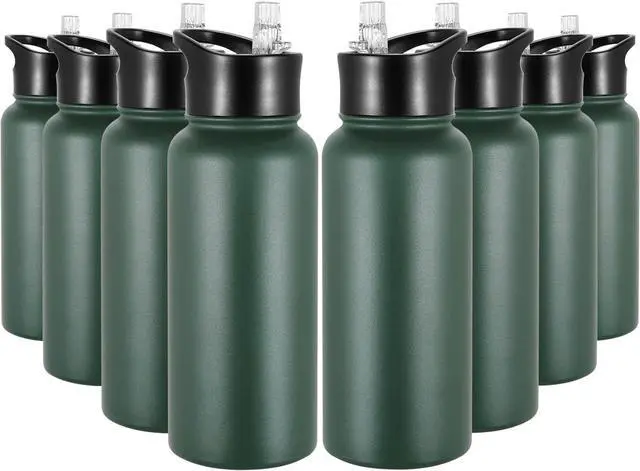 32 oz Insulated Water Bottle Bulk 8 Pack, Stainless Steel Sports Water Bottles with Straw Lid & Wide Mouth Lids, Double Walled Vacuum, Leak Proof, Dark Green